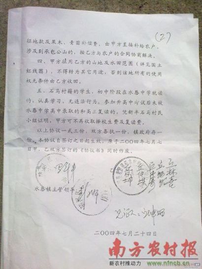 2004年,为支持水唇镇发展教育事业,石马村民与水唇中学达成协议。其中规定,水唇中学“征用”石马村的145亩土地用于新校区建设,而石马村民除了可以按照水田每亩4000元、旱地每亩1600元、山地每亩800元的标准获得一定数量的补偿款外,镇政府可无偿解决其村小组办公用房问题,石马村学子就读水唇中学高中,还可免交择校及复读费等。在这份用地协议中,双方特别约定,水唇中学不得将上述地块挪作他用,否则石马村“有权将土地收回”。