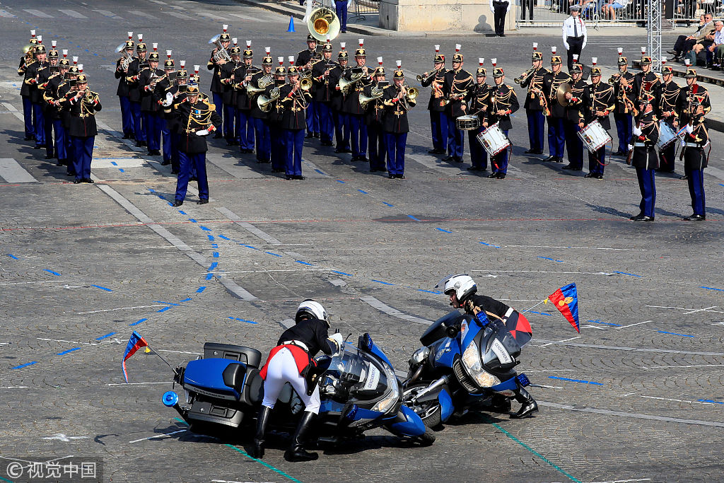 当地时间2018年7月14日,法国巴黎,法国宪兵骑摩托车摔倒。7月14日是法国国庆日“巴士底日”。香榭丽舍大街举行盛大的国庆阅兵仪式,法国总统马克龙现场观礼。今年恰逢第一次世界大战结束百年,因此阅兵式规模也较大。图为宪兵骑摩托车对撞摔倒。供图:GONZALO FUENTES/视觉中国