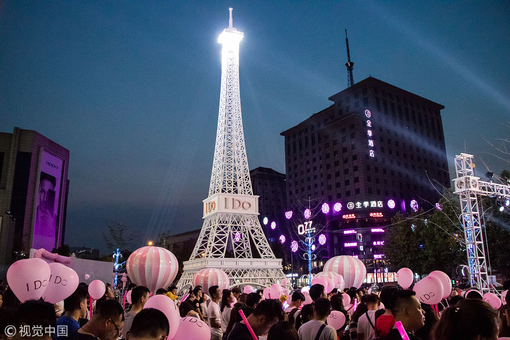 2018年6月30日晚,济南一商家举办活动,邀请百余对情侣现身街头,浪漫拥吻。在夜幕下,共同为爱情点亮“埃菲尔铁塔”。供图:视觉中国