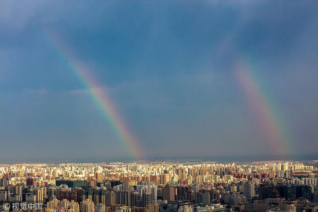 2018年6月29日,北京雨后现双彩虹。 图片作者:山色空蒙/视觉中国