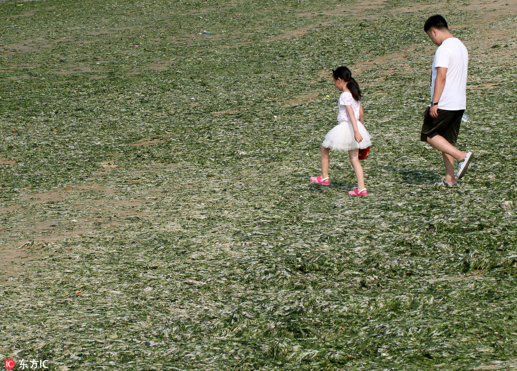 2018年6月27日,山东烟台第一海水浴场出现大片海白菜,游客漫步海滩,如同置身草原。
