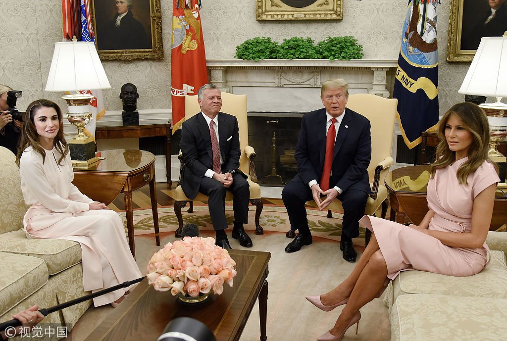 当地时间2018年6月25日,美国华盛顿,特朗普与夫人梅拉尼娅在白宫与到访的约旦国王阿卜杜拉二世及拉尼娅王后举行会晤。供图:视觉中国