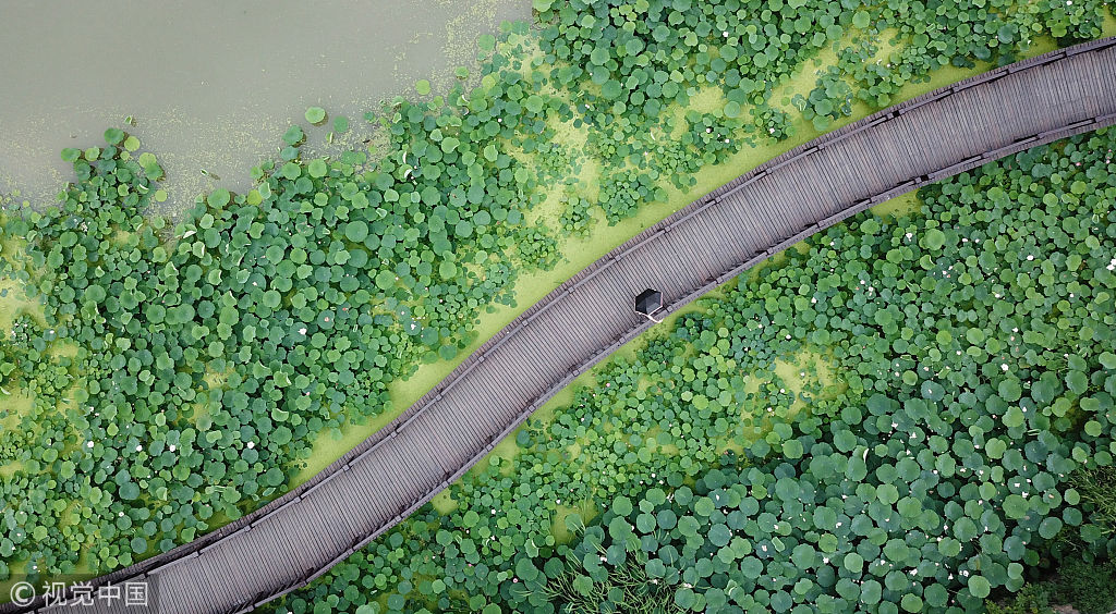 2018年6月25日,江苏省扬州市荷花池公园内的荷花纷纷盛开,呈现出一派“映日荷花别样红”的美丽景致,为古城增添一道靓丽的风景,也给炎炎夏日增添一份清凉,引来众多游客驻足观赏。图片作者:孟德龙/视觉中国
