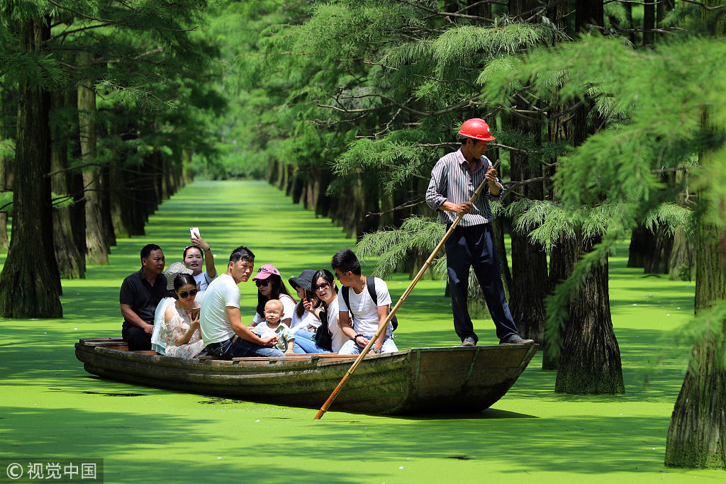 2018年6月23日,武汉,游人在涨渡湖湿地“水上森林”泛舟观鸟。入夏以来,位于湖北省武汉市新洲区的涨渡湖湿地,万余棵池杉整齐地栽种在1米深的水中,人、鸟、林、水和谐相融的独特“水上森林”奇观吸引大量游客寻访观光。供图:视觉中国