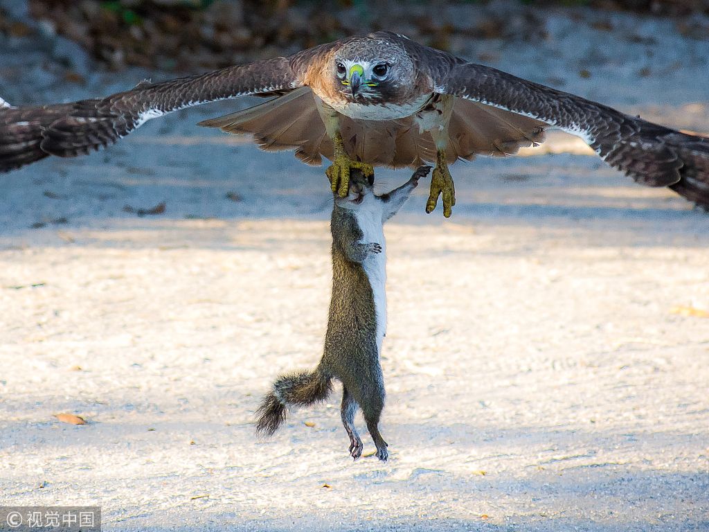 2018年6月20日报道,近日,美国南卡罗来纳,35岁的摄影师Rafael De Armas抓拍到了一只不幸的松鼠被红尾鹰从地面上拽走的瞬间。供图:Solent News/视觉中国