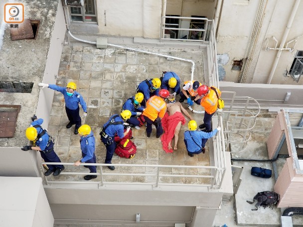 2018年6月18日,香港。早上8时许,警方接报在油麻地炮台街有人由高处堕下,警察和消防员随即赶到。在炮台街与西贡街交界休憩公园,发现一名全身赤裸南亚裔男子,受伤被困在公厕屋顶水箱上。来源:东网