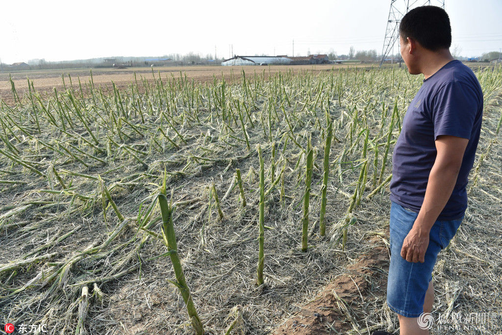 2018年6月14日,山东省日照市莒县陵阳镇小官河口村,村民正在农田里查看被冰雹砸烂的玉米地。6月13日,受高空冷涡天气影响,从16时20分开始,莒县自西向东局部地区出现大风雷雨冰雹强对流天气。在莒县长岭镇、陵阳镇、刘官庄镇等部分地区,出现冰雹。据村民们介绍,当天傍晚,冰雹持续约有40分钟,开始降落的冰雹有黄豆大小,后来越下越大,就像鹌鹑蛋那么大。来源:东方IC