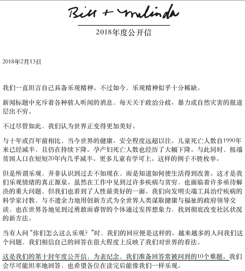 2018年2月13日18时(北京时间),比尔和梅琳达•盖茨夫妇分享了他们的2018年度公开信《我们常被问到的10个难题》,这是他们发布的第十封年度公开信。在信中,比尔和梅琳达就过去几年中常被问到的难题坦率作答。这些问题来自诸多方面,如非营利部门的合作伙伴、政府领导和社会公众等,既有基金会的支持方,也有基金会的批评方。