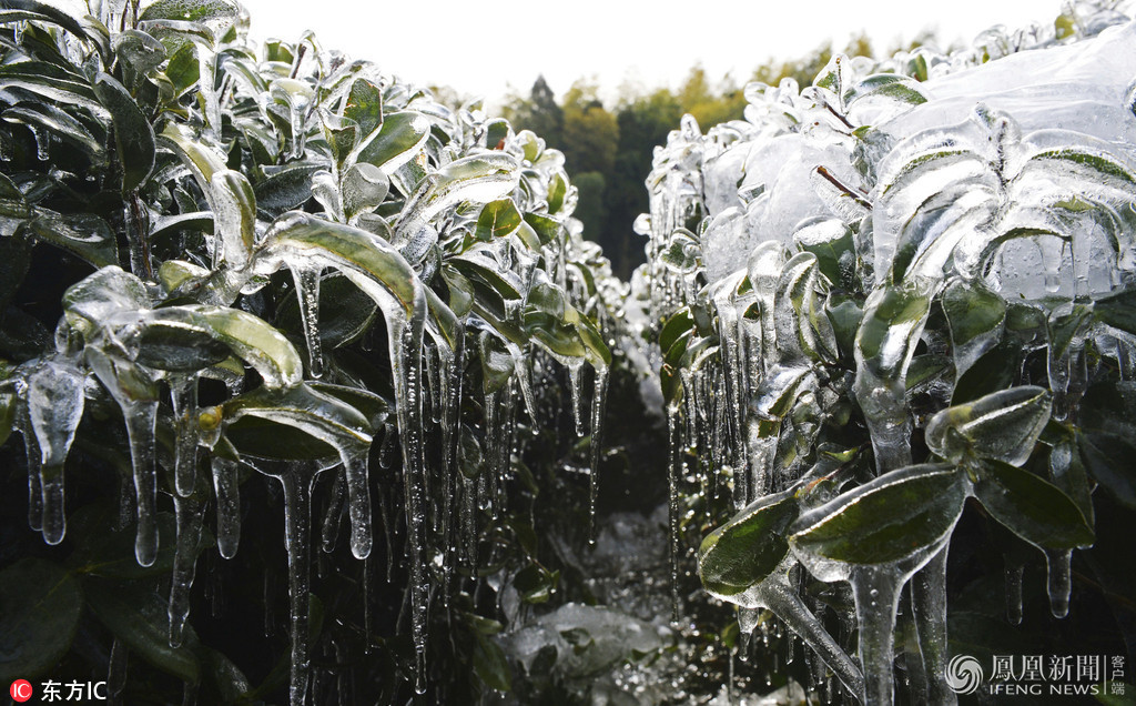 日本农民为茶树喷水防冻 晶莹剔透若“冰晶森林”