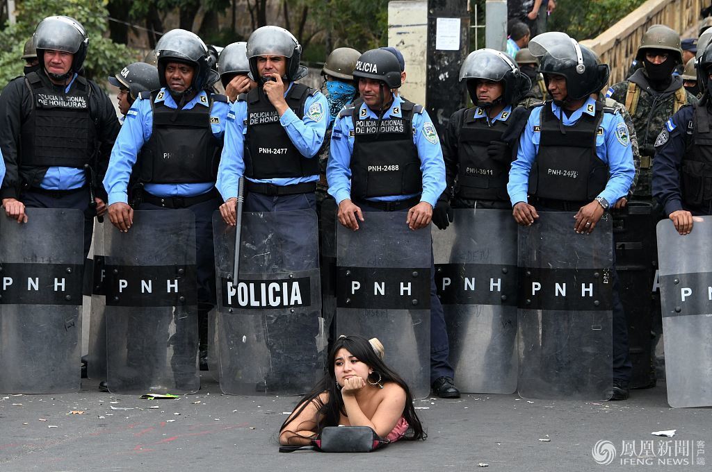 洪都拉斯抗议现场 女子趴地挑衅警察