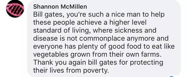 @Shannon McMillen:盖茨,你是个超棒的人,太感谢你啦,让在贫困地区生活的人不再饱受疾病的困扰,让他们的生活免受贫穷之害!