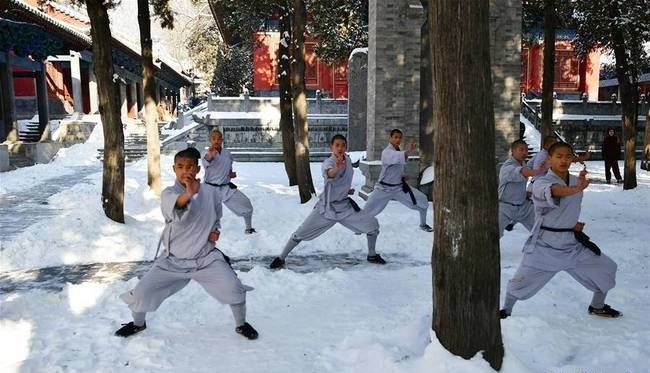 武僧在少林寺表演少林传统武术。位于河南嵩山五乳峰下的少林寺,是中国汉传佛教的“禅宗祖庭”和少林武术的发源地。连日来的大雪让少林披上了一层银装,武僧们在雪地中演练武术。