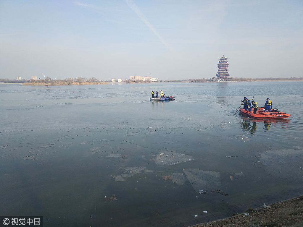 2018年1月4日消息,山东滨州。1月2日,蒲湖,一名在冰面上钓鱼的男子不慎落入冰冷的水中。事发后,滨州警方、消防、滨州蓝天救援队及120急救都赶到了现场,展开救援。据了解,出事男子大约在2日11点半落水,至当天下午5点,救援队仍在现场搜救,但未发现男子踪迹。图片作者:王键/视觉中国
