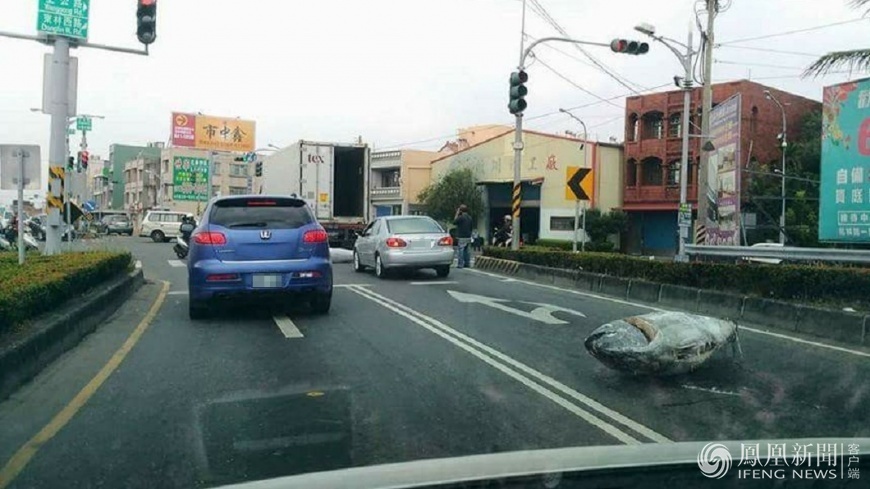 12月16日,台湾高雄林园区沿海路与王公路有两条大鱼横躺在马路上,令路过的司机大吃一惊。原来事件起因是一辆载运金枪鱼的冷冻车未关好车门,导致两条巨型的金枪鱼于行车期间从货车的冷冻柜掉下来。