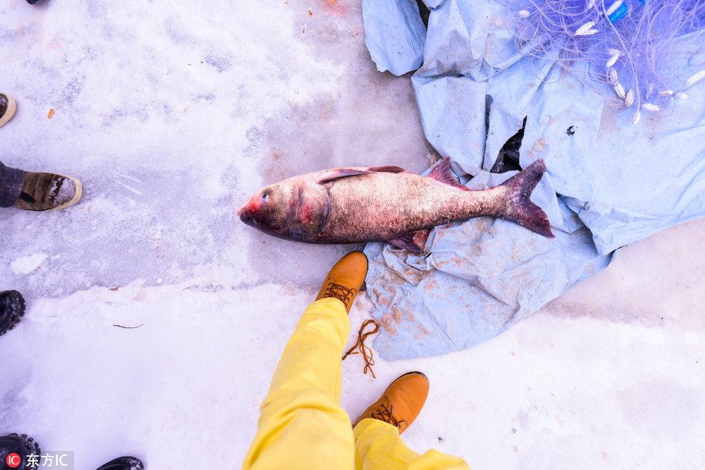 内蒙古察尔森湖冬捕名气当然不能与查干湖相比。但每到冬季12月份开始,察尔森湖冰面结冰至50厘米左右的时候,当地的渔民都会开始冬捕,方式方法甚至祭祀唤醒冬网仪式都一样。在这个原始冬捕人工拉网的过程,每分每秒,都有各种各样的鱼儿“浮”出水面。瞬间缺氧加上30度的温差,被拉上湖面的鱼,血液迅速充盈它们的腮,现场血红雪白……