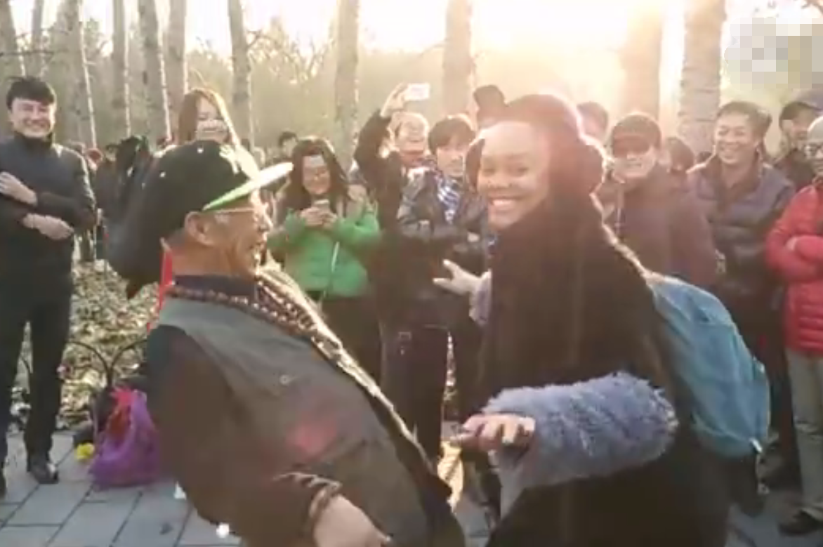北京大爷与外国美女尬舞 魔性动作逗笑行人