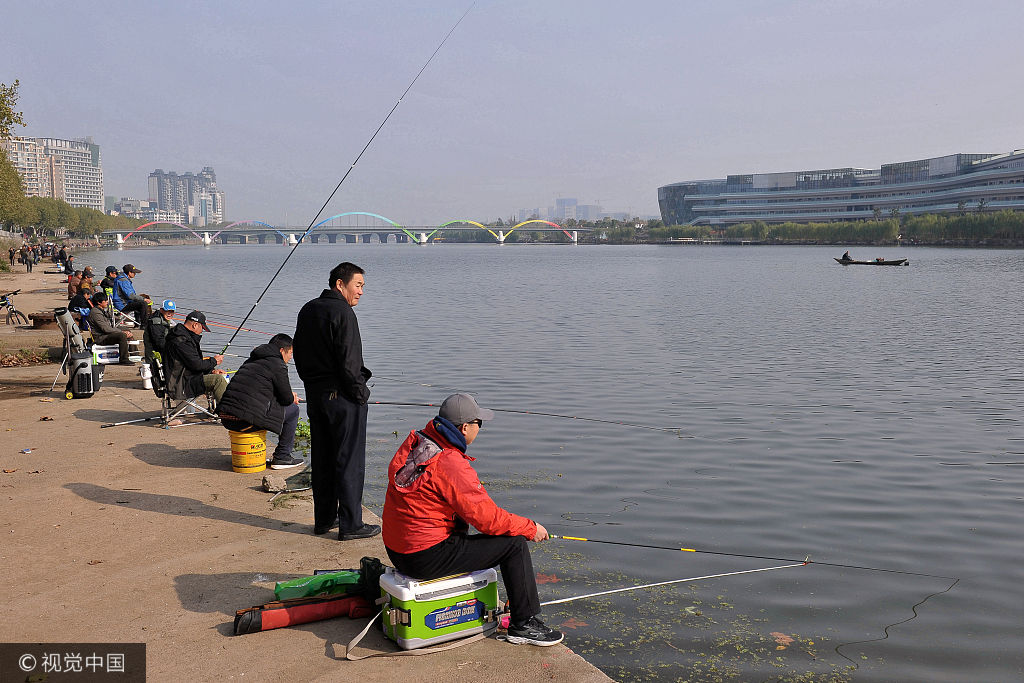 2017年11月22日消息,浙江金华。从21日开始,渔政部门在婺江放流鱼苗,沿着婺江西路,大批钓鱼爱好者纷纷聚集,人数之多,引起了市民纷纷拍照。记者22日上午9点到现场发现,沿着江岸从通济桥开始向西一直到河盘桥段,4、5百米的江岸或坐或站着上百名垂钓爱好者,上百根鱼竿整齐地“挤”在长长的岸边。图片作者:时补法 /视觉中国