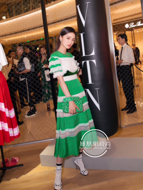 11月1日,李沁亮相品牌活动,一袭绿色蕾丝花边长裙给秋日增添一份清新浪漫。