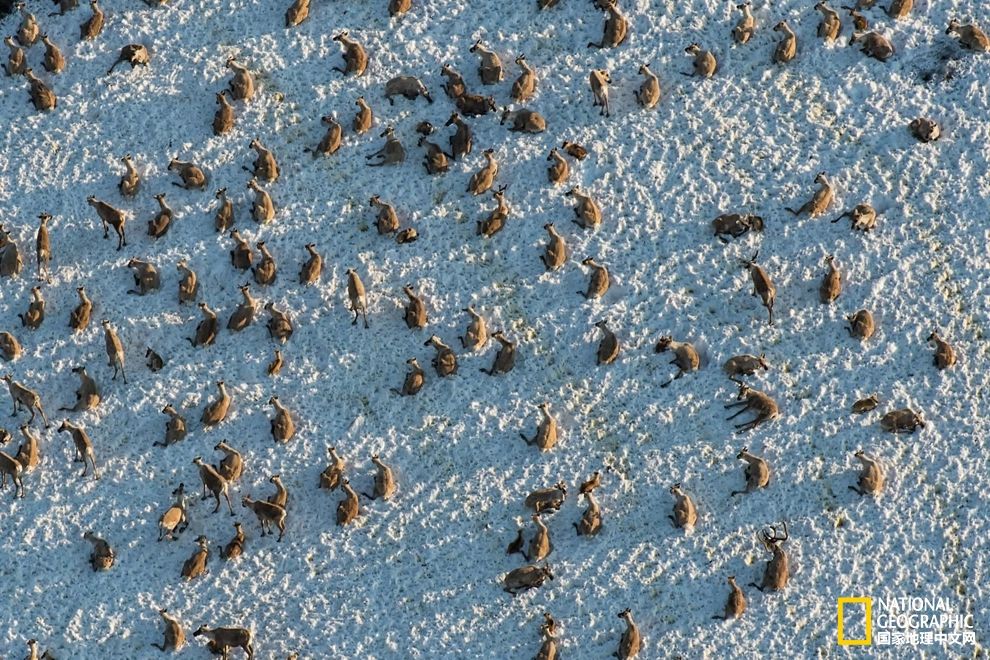 在阿拉斯加,可能出现的石油开采(储量接近103亿桶的石油)给这片海岸平原带来了环境威胁,威胁的罪魁祸首是人类。于是,20世纪60年代,阿拉斯加北极国家野生动物保护区成立,以应对人类威胁,保护这里独有的荒野和野生动物。图为18万头强壮的北美驯鹿每年迁徙数千公里,前往阿拉斯加海岸平原的繁育地。 摄影:PETER MATHER, NATIONAL GEOGRAPHIC CREATIVE
