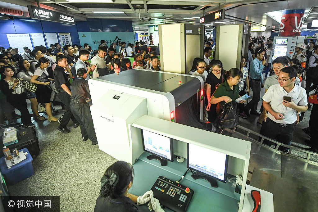 2017年10月13日消息,广州。12日开始,广州地铁纪念堂站、公园前站、广州火车站、珠江新城站、厦滘站、天河客运站等6个地铁站率先实施安检升级。供图:康健/视觉中国
