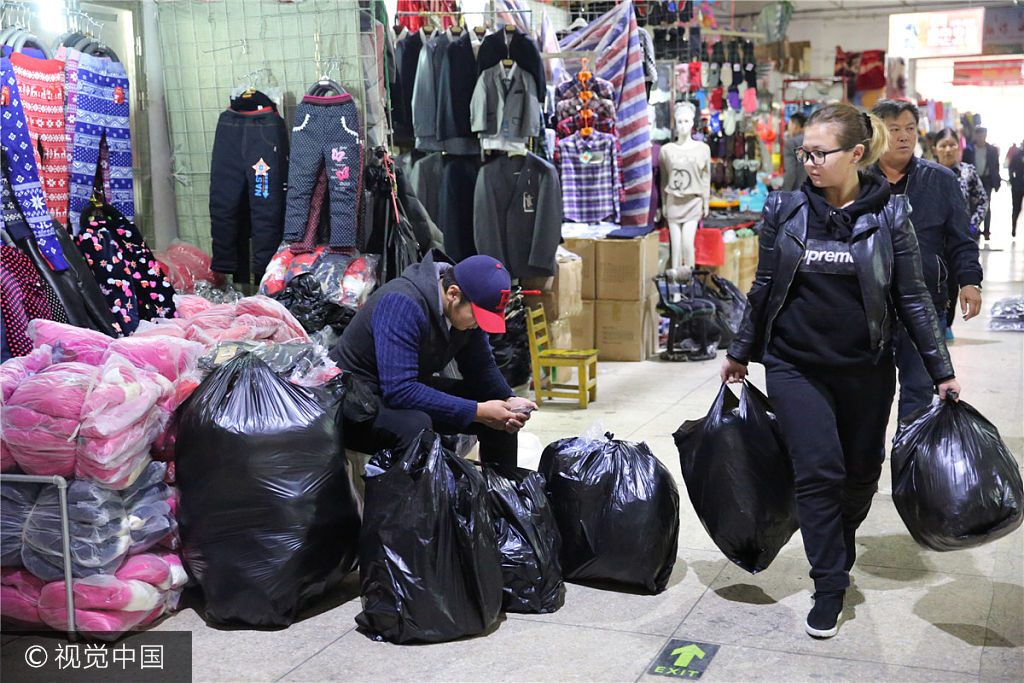2017年10月8日,内蒙古二连浩特,进入10月份,蒙古国乌兰巴托出现大雪降温天气,气温低至零下,大批蒙古国民众涌入中国边境城市二连浩特抢购防寒衣物,在二连浩特义乌、温州商城到处能看到蒙古国游客在买买买。北疆视界/视觉中国