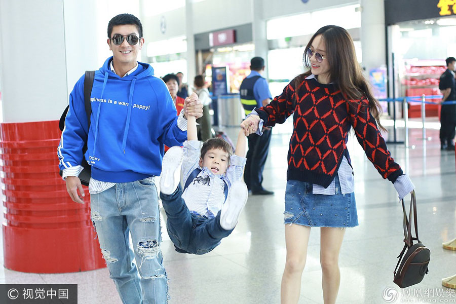 9月20日,霍思燕、杜江、嗯哼一家三口现身机场。嗯哼“乘坐”爸爸、妈妈搭成的“人肉秋千”可爱起飞。