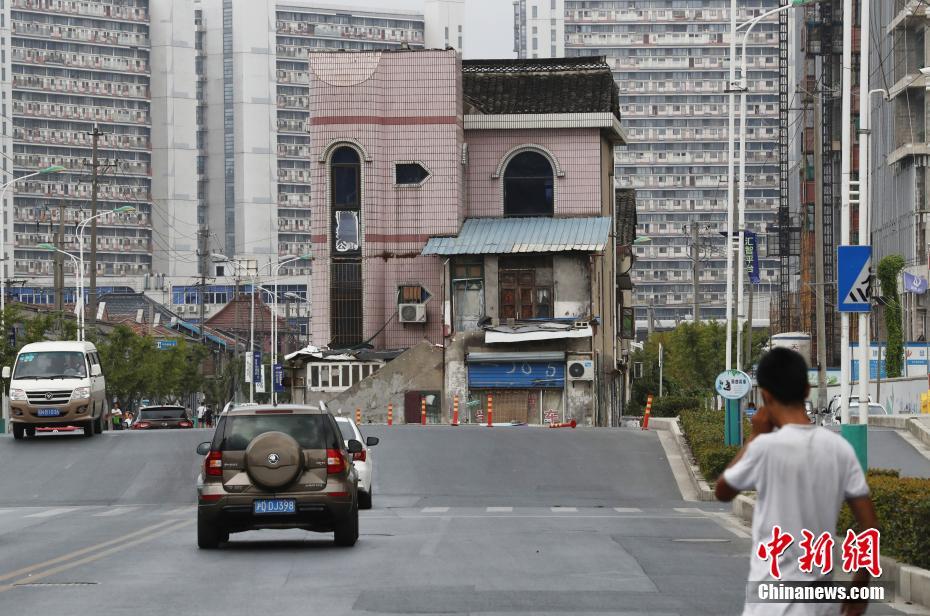 8月31日,在上海松江区沪亭北路的道路中央,仍留有一处未拆除的房子,影响交通。多年来这处马路中央的房子,已成为一道独特的“风景线”。