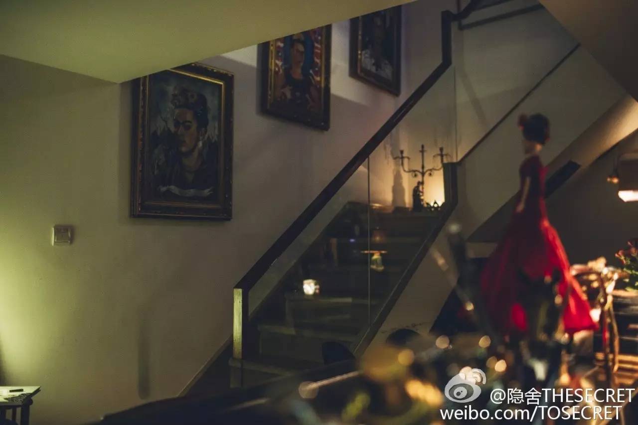 开在20楼公寓里的小酒吧,特别精致,落地玻璃窗外是北京的城市街景,红色的丝绒墙身、深色的皮质沙发,还有吧台上复古的摆饰,不难看出店主是个细节控以及是弗里达的粉丝。