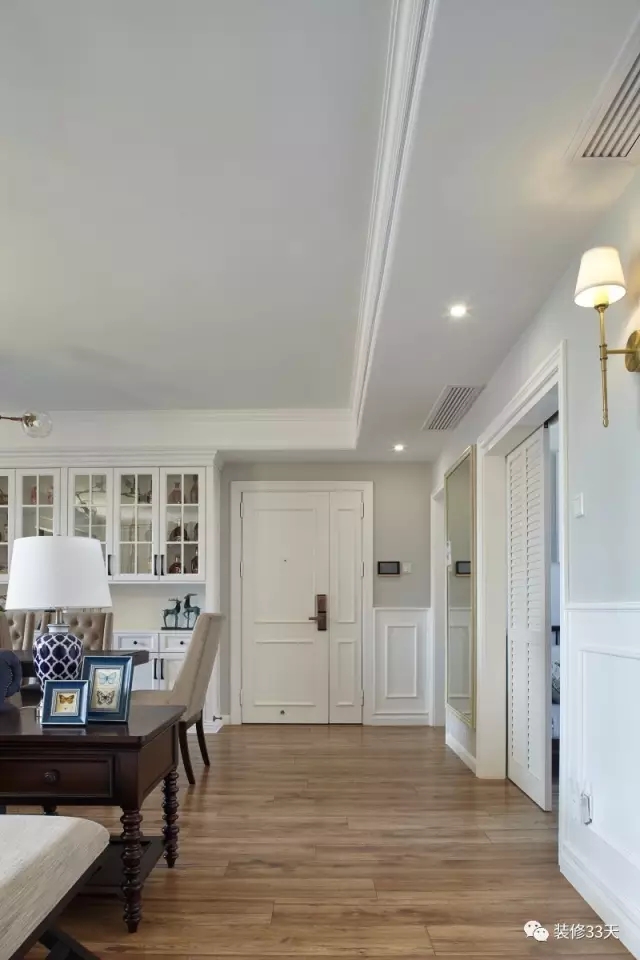 ▲ 使用面积为116平,装修造价46万,以简约美式风格为设计主题,运用白色,米色,靛蓝色,深咖色为空间色调,配以少量的金属材质作点缀,入户没有作独立空间,让视觉空间更加开阔。(本文来源:装修33天)
