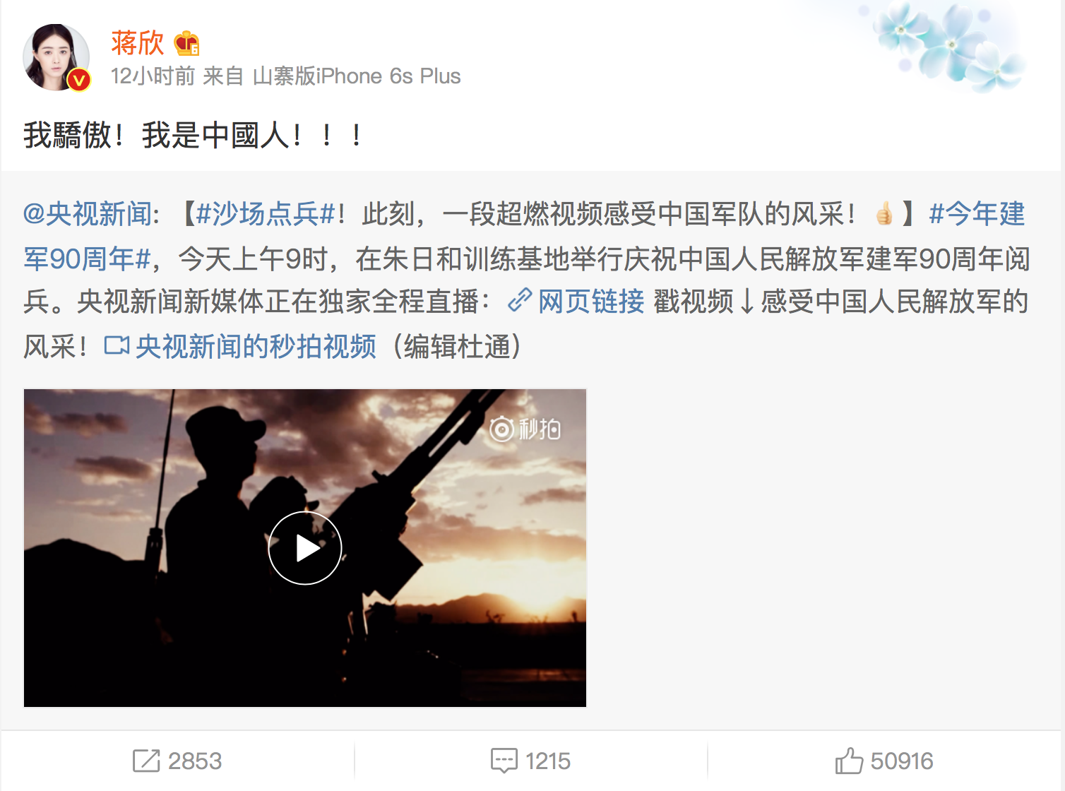 歌手晞点赞建军90周年:“致敬每一位中国军人!国强,则少年强!”