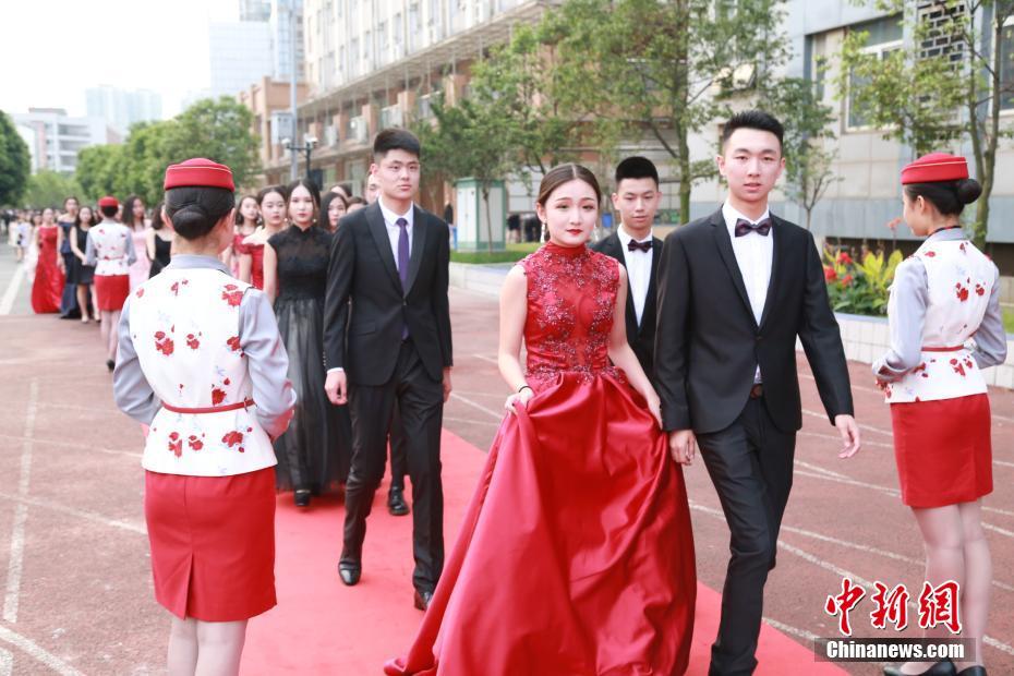 数十辆豪车助阵,精致的妆容、靓丽的晚礼服……一场华丽的青春毕业舞会就此上演。6月19日晚,成都航空旅游职业学校空乘专业部举行的主题为“爱尚蓝天梦享空乘”的毕业舞会,现场一派欢乐。毛成山 摄