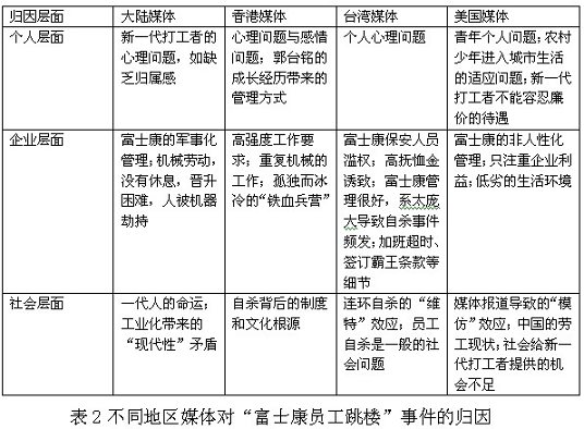 但是,不同地区媒体对事件本身给予了不同程度、不同角度的关注。中国大陆媒体主要关注作为普通人的跳楼员工的生活及其代表的新生代打工者的生存状态,跳楼员工背后的家庭生活和心理动态。台湾媒体关注台商在大陆的形象、声誉以及两岸经贸关系。美国媒体关注中国工人涨薪之后给美国经济带来的影响。香港媒体既关注跳楼员工背后的生活,也关注郭台铭所建立的“代工帝国”及其经济发展模式,视角介于中国大陆媒体与台湾媒体之间。