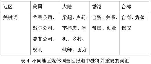 运用词频软件统计分析后发现,某些词汇在不同地区媒体的调查性报道中得到了凸显(如表3)。