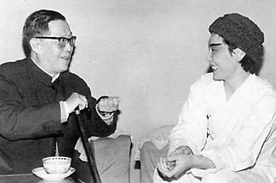 上世纪八十年代,曹禺与尚未卸妆的裴艳玲交谈。(本版照片由受访者提供)
