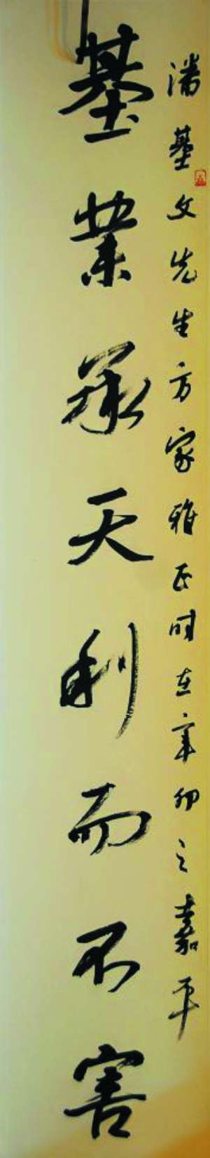 张旭光赠送潘基文秘书长的藏头行书联:基业承天利而不害,文心得道为而不争。