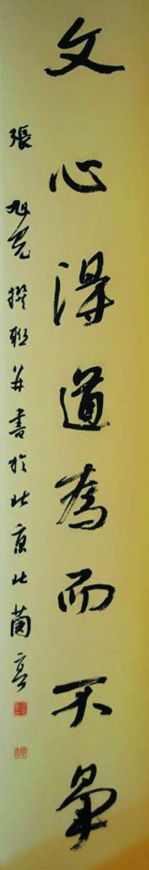 张旭光代表中国参展名家和北兰亭向潘基文现场赠送了一幅行书对联:“基业承天,利而不害;文心得道,为而不争。”此联一是将“基文”二字嵌在联头,二是将潘基文连任联合国秘书长演说时引用过的两句中国古代名言:“天之道,利而不害;圣人之道,为而不争”,作为内容上下成联,起承转合,流畅自然。潘基文现场诵读了对联,在翻译的帮助下读懂了文义,开怀大笑。他感叹,把名字和名言联到一起,巧妙之极,书法又高古动人,非大师而不能为,盛赞中国对联艺术与书法艺术结合的深奥与感染力。