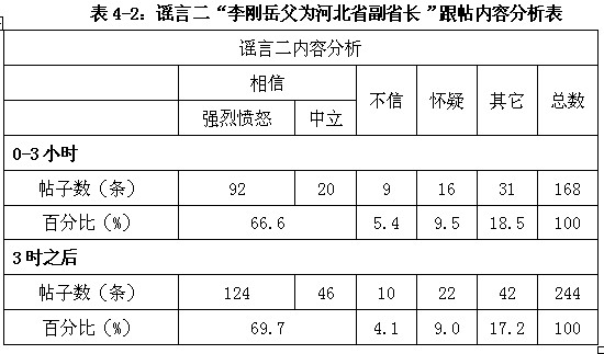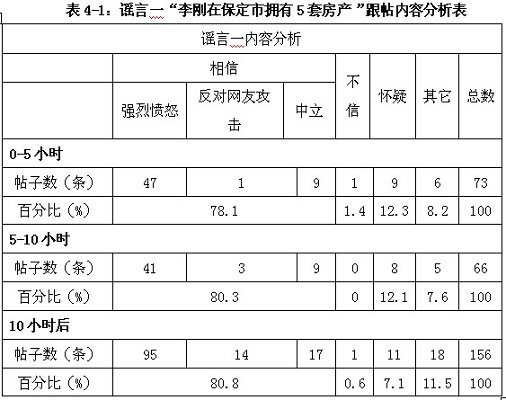 可以看到,该帖发布5小时之内,得到73条回复,78%的网民相信了谣言,其中47条帖子表达了强烈的不满和愤怒,仅一位网友认为大家的谴责是无中生有:拥有五套房产其实很正常。前5小时内,也仅一位表示完全不相信,认定是谣言,另外9条回复表达了较大的质疑,其它类回复占8.2%。在谣言一刚开始流传的时候,人们的注意力明显集中在叙述的情况本身,即李刚拥有五套房产,网友对此展开的评述,并没有偏向事件的细节或其它方面。当日17:40分,名为voile的网友发布了一条留言,对帖子的内容作了补充,将李刚五套房产的详细情况作了介绍,包括每套价值、地段介绍,最后还提出了疑问:“注:以上为李刚在保定当地的房产,李刚是否在北京上海等地买房置业目前尚不清楚。”自这条回复之后,人们对谣言的内容基本相信,责骂帖数直线上升。
