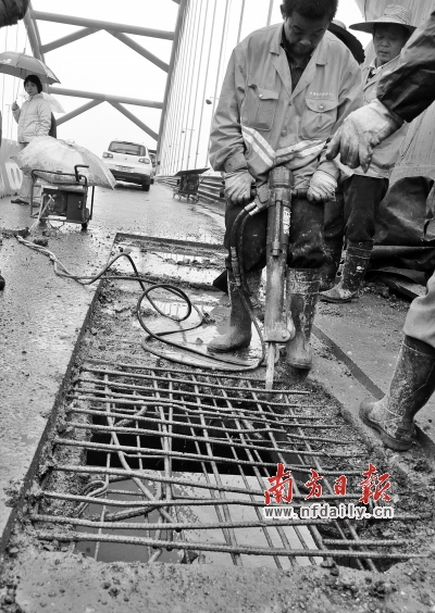 天空阴沉,小雨淅沥,昨日下午两点,原来繁忙的佛陈大桥往陈村方向已封闭,桥下路口的电子显示牌提醒封路的信息,交警在现场引导车辆绕行。桥上,工作人员正冒雨抢修,机械声轰隆,受损桥面混凝土被撬开,一排排钢筋祼露出来,有的扭曲,有的被碾断。记者看到,局部桥面已穿孔,可见桥底河水。