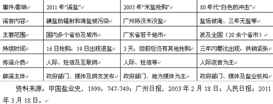 传统媒体作为舆论主体的时期,其对谣言事件已有报道和辟谣。但对于抢盐等商品购销风波,一些传媒为防止“过犹不及”、消极作用,常常采取“只报道货源充足”、“暂缓或禁止直播”。其中一些做法也延续至今年3月的谣言事件中(黄毅,2011)。实际上,早在80年代的“谣盐”风波中,已有辟谣报道这样写道:在被称作“信息时代”的今天,为何会发生这种荒唐事?是信息不通,还是“大道消息不如小道来得快”的后遗症?