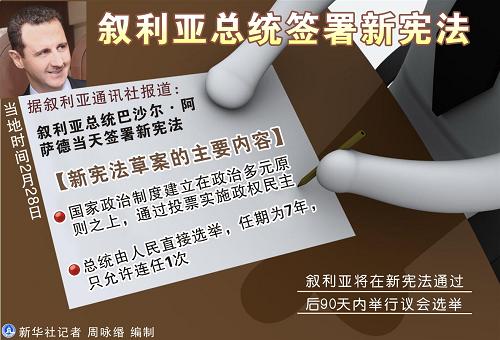 2月28日,被喻为“中东幼狮”的叙利亚总统巴沙尔签署刚刚通过的新宪法,宣布叙议会选举将在新宪法生效后90天内举行。这部新宪法草案核心内容是:改一党制为多党制;总统任期7年,可连任一届,改革从本质上,把叙利亚从叙利亚阿拉伯社会复兴党一党制,转变为多党制的民主政体。