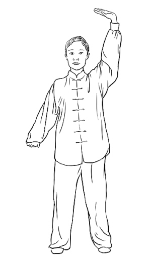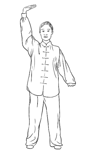 动作一:接上式,两腿徐缓挺膝伸直;同时,左掌上托,左臂外旋上穿经面前,随之臂内旋上举至头左上方,肘关节微屈,力达掌根,掌心向上。掌指向右;同时,右掌微上托,随之臂内旋下按至右髋旁,肘关节微屈,力达掌根,掌心向下,掌指向前,动作略停;目视前方。