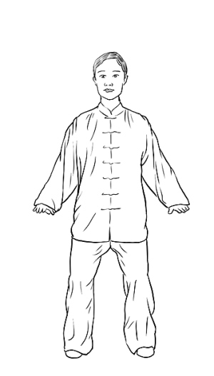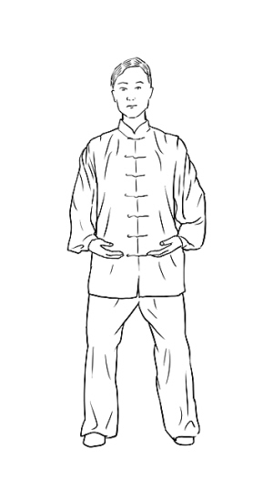 动作二:松腰陈髋,身体重心缓缓下降;两腿膝关节微屈;同时,左臂屈肘外旋,左掌经面前下落于腹前,掌心向上;右臂外旋,右掌向上捧于腹前,两掌指尖相对,相距约10厘米,掌心向上;目视前方。