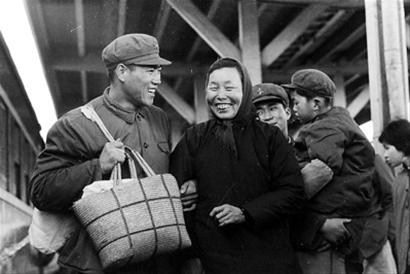 1977年2月20日,警备区某部指战员在车站扶老携幼。