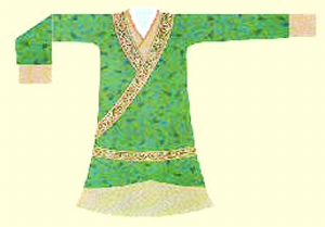 袍服自汉代被用于朝服。深衣最智巧的设计,是在两腋下腰缝与袖缝交界处各嵌入一片矩形面料,其作用能使平面剪裁立体化,可以完美地表现人的体形,两袖也获得更大的展转运肘功能。