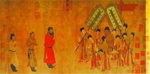 唐朝阎立本《步辇图》画的是贞观十五年(公元641年),吐蕃丞相禄东赞前往京都长安,迎文成公主入藏,受到唐太宗接见的历史故事。唐代男子服饰,以幞头袍衫为主,在这幅作品中反映得比较全面。画中男子除吐蕃使者外,都着幞头袍衫,连皇帝也不例外。