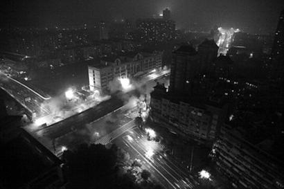半个小时以后,附近车流量明显减少,居民撤离工作开始展开。记者看到,核心爆破区附近第一排居民楼的灯绝大多数已经熄灭,但几家沿街的快捷酒店仍照常营业。居委出动工作人员,对尚未撤退的街面商铺进行挨家挨户的劝离。