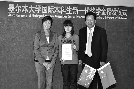 郑州中澳(国际)学校刘校长(右)、墨尔本大学国际部主管(左),共同祝贺墨尔本大学“新一代国际奖学金”亚洲第一人——中澳学子李倩(中)。