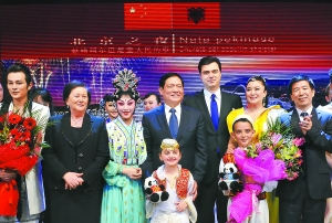 3月18日晚,在阿尔巴尼亚首都地拉那,中共中央政治局委员、北京市委书记刘淇(左四)与阿尔巴尼亚总理夫人利丽·贝里沙(左二)、地拉那市市长巴沙(右四)和中国驻阿尔巴尼亚大使叶皓(右一)在演出结束后上台与中国和阿尔巴尼亚演员一起合影。当天,《北京之夜》大型文艺晚会在地拉那举行。新华社记者 武巍摄
