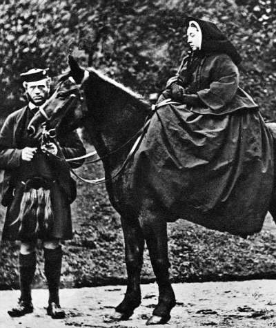 1863年,维多利亚女王与男仆布朗准备乘马外出。