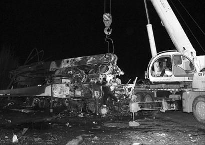 事故现场被烧毁的工程车